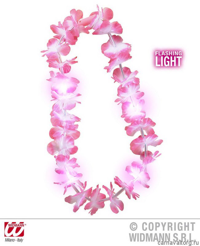 Карнавальный аксессуар, леи гавайские светящиеся, внутри цветов подсветка мини лампочки, включается нажатием кнопки, батарейки в комплекте. Бренд производителя: WIDMANN, Италия.