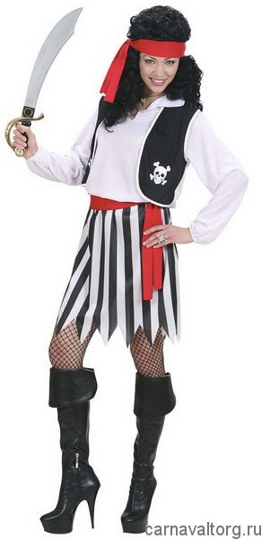 Костюм карнавальный "Пиратка Веселый Роджер", женский Комплектация: рубашка, жилет, юбка, повязка на голову. Другие аксессуары на фото представлены для полноты карнавального образа и в комплектацию не входят, их можно приобрети отдельно в разделе Карнавальные аксессуары. Бренд производителя: WIDMANN, Италия. Материалы: синтетика.