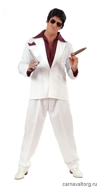 Костюм карнавальный "Майами гангстер" мужской. Комплектация: рубашка, пиджак, брюки, платок. Остальные аксессуары показаны на фото для полноты и красочности образа, и в комплект не входят, вы найдете их в разделе нашего сайта Аксессуары. Размеры: S, M, L (наличие показывается автоматически) Бренд производителя: WIDMANN, Италия. Материалы: синтетика и натуральные ткани.