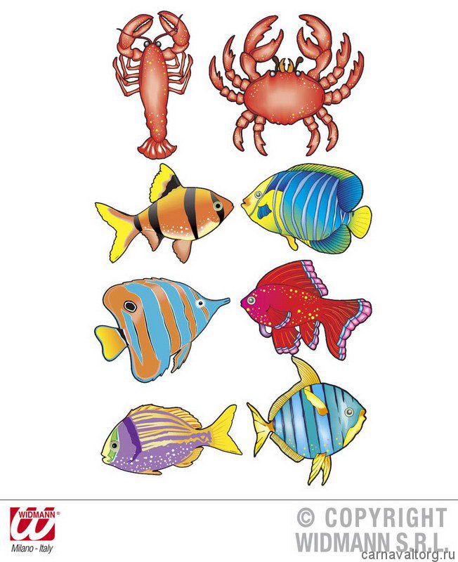 Декорация "Крабы и рыбы" 8 шт. ассорти, размер каждой фигурки 40 см., цена за одну упаковку 8 шт. Бренд производителя: WIDMANN, Италия.
