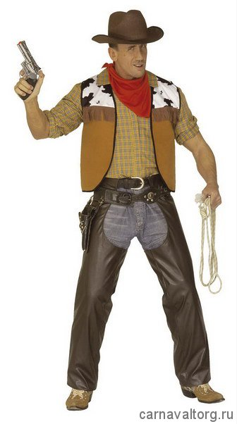 Чапсы ковбойские, мужские, цвет коричневый. Комплектация: чапсы (кожаные брюки для верховой езды, носятся поверх джинсов) с ремнем. Остальные аксессуары показаны на фото для полноты и красочности образа, и в комплект не входят, вы найдете их в разделе нашего сайта Аксессуары. Размеры: M-L Бренд производителя: WIDMANN, Италия. Материалы: кож.зам.