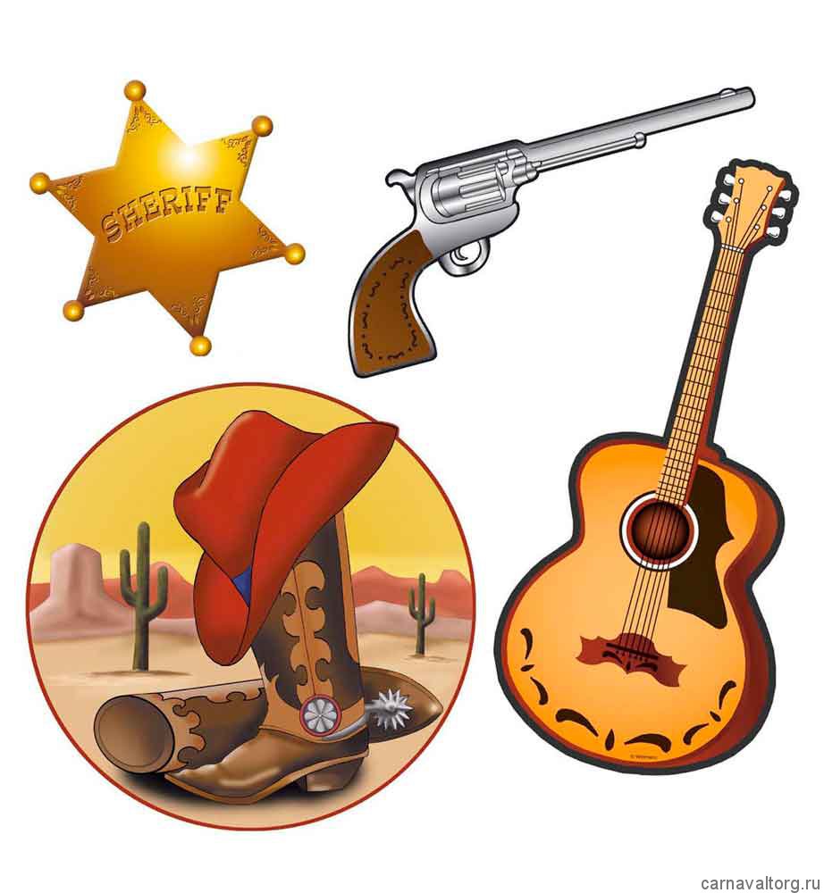 Декорация "Вестерн" это сразу 4 настенные декорации в наборе: ковбойский кольт, гитара, звезда шерифа, баннер с ковбойскими сапогами. Размер каждой 30-40 см. Бренд производителя: WIDMANN, Италия.