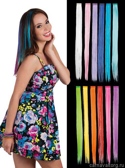 Пряди цветные, крепятся на заколке (входит в комплект), цена за 1 шт. В ассортименте 12 цветов, укажите в примечании к заказу выбранный вами цвет. Материал: иск. волосы.