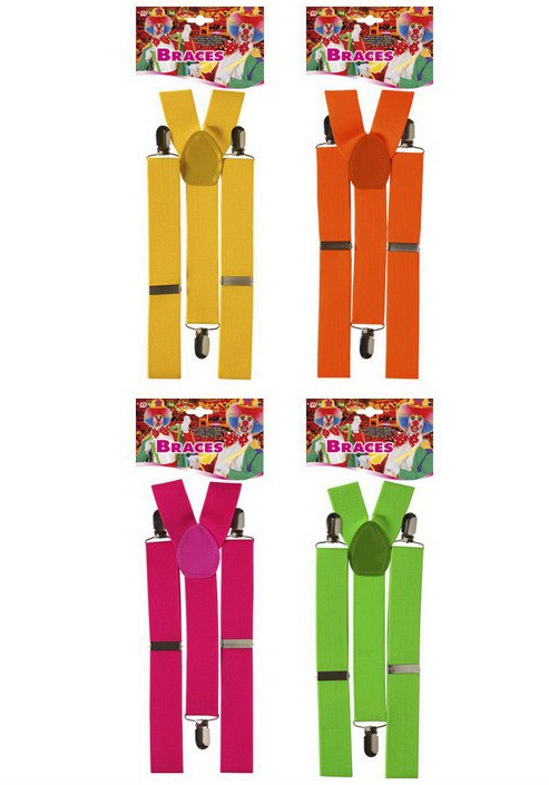Подтяжки "Неон" цветные, для яркого костюма клоуна или ведущего. Ассорти цвета: желтый, зеленый, оранжевый, розовый - пожалуйста укажите желаемый цвет в примечании к заказу. Размер один стандартный, регулируются по длине. Бренд производителя: WIDMANN, Италия. Цена указана за 1шт.