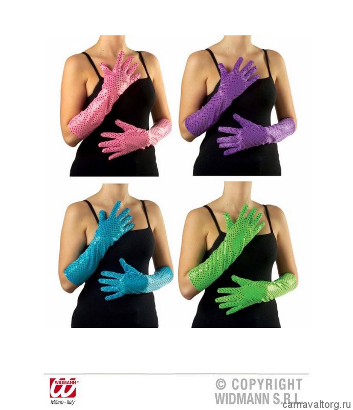 Перчатки карнавальные, синтетика. Размер один. Длина 41 см. Ассортимент: 4 цвета - пожалуйста, если цвет имеет значение, укажите желаемый цвет в примечании к заказу. Цена указана за 1 пару. Бренд производителя: WIDMANN, Италия.