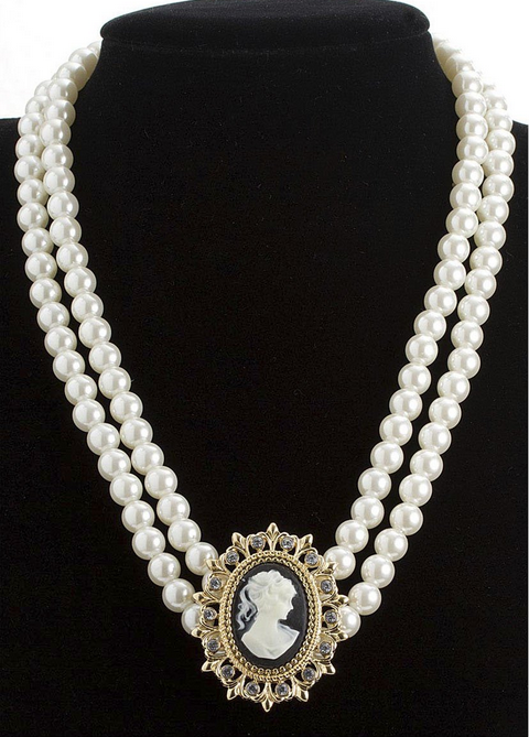 Роскошная камея "Барокко" - бусы в два ряда "жемчужные" с камеей в центре. Бижутерия карнавальная, материалы: пластик, стразы. Бренд производителя: WIDMANN, Италия.