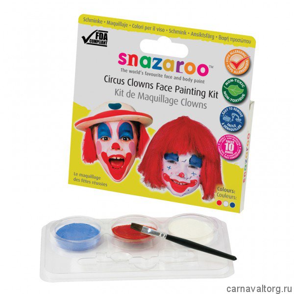 Тематический набор грима из трех цветов "Клоун" - тщательно подобранное трио цветов для создания идеального образа! Тематические наборы грима Snazaroo - прекрасный выбор для детских праздников или вечеринки, все краски на водной основе, аквагрим Snazaroo легко наносится и также легко снимается! Узнайте как нарисовать этим набором грим "Клоун" - смотрите уроки аквагрима "Шаг-за шагом" здесь! Набор содержит 3 цвета по 2 мл.: белый, красный, синий. 10+ означает: объема этого набора грима хватит закрасить минимум 10 лиц!
