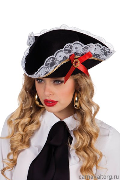 Треуголка "Пиратка Стейси" - роскошная пиратская треуголка с кружевом, украшенная бантом с "драгоценностями". Размер: один. Материал: синтетика.