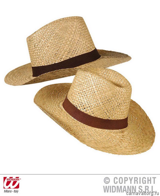 Шляпа карнавальная соломенная, цвета ленты на тулье два цвета ассорти - черный и коричневый. Бренд производителя: WIDMANN, Италия.